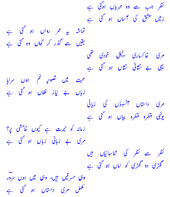 naz^ar jab se woh mehrbaaN ho gayee haizameeN i'shq kee aasmaaN ho gayee hai!