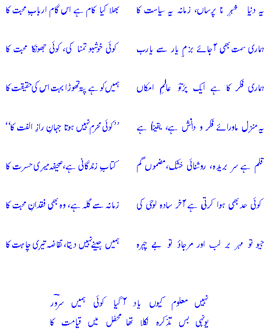 yeh dunyaa shehr-e-naa-pursaaN, zamaanah yeh siyaasat kaabh`alaa kyaa kaam hai is gaam arbaab-e-muHabbat kaa?