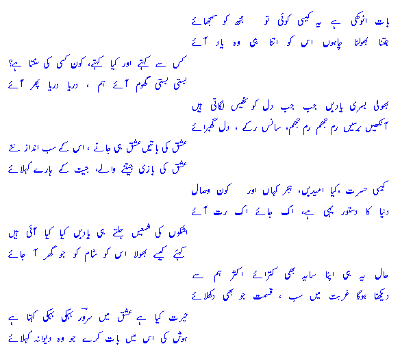baat anokh`ee hai yeh kaisee, koyee to mujh` ko samjh`aaYejitnaa bh`oolnaa chaahooN us ko, utnaa hee woh yaad aaYe!