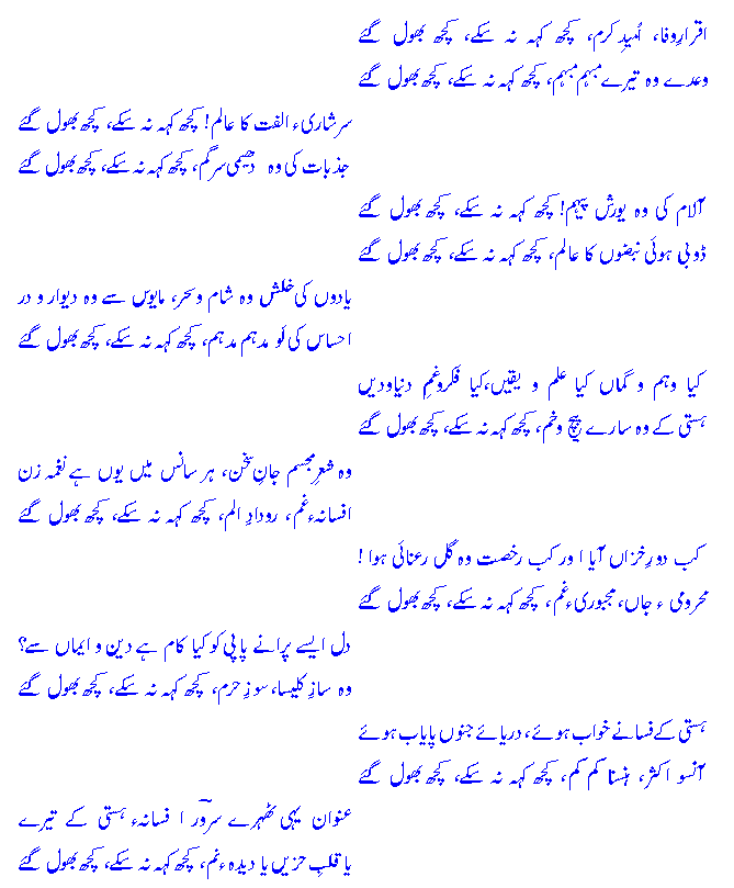 iqraar-e-vafaa, ummeed-e-karam! kuch` keh nah sake, kuch` bh`ool gaYe!vade voh tire mubham, mubham! kuch` keh nah sake, kuc`h bh`ool gaYe!