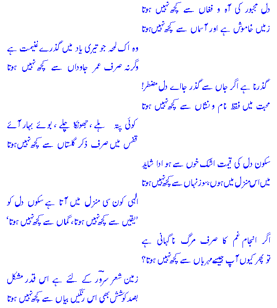 dil-e-majboor kee aah-o-fuGhaaN se kuch` naheeN hotaazameeN Khaamosh hai aur aasmaaN se kuch` naheeN hotaa!