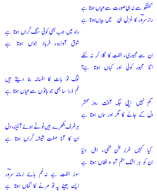 guftgoo se nah hee Soorat se a'yaaN hotaa hairaaz "Sarwar" kaa Gazal hee meN bayaaN hotaa hai!