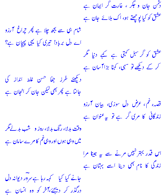 dushman-e-jaan-o-jigar Ghaarat-gar-e-eemaan haii'shq ko kyaa pooch`te ho, ik balaa-e-jaan hai!