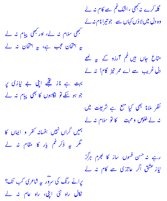 gilah kare nah kabh`ee, ashk-e-Gham se kaam nah lewoh dil maiN laa,ooN kahaaN se jo teraa naam nah le?