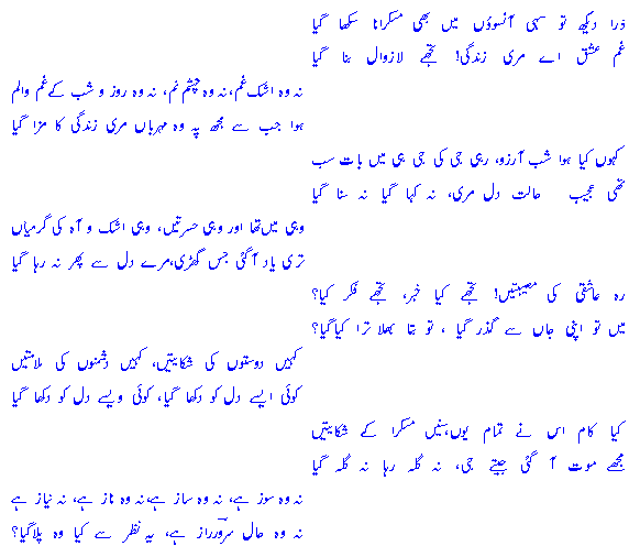 Zaraa dekh` to sahee aaNsu,oN meN bh`ee muskuraanaa sikh`aa gayaaGham-e-i'shq ai miree zindagee! tujh`e laa-zawaal banaa gayaa!