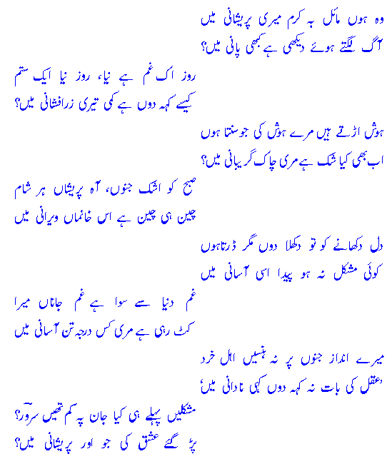 woh hoN maa,il ba karam meree pareshaanee meN?aag lagte huYe dekh`ee hai kabh`ee paanee meN?