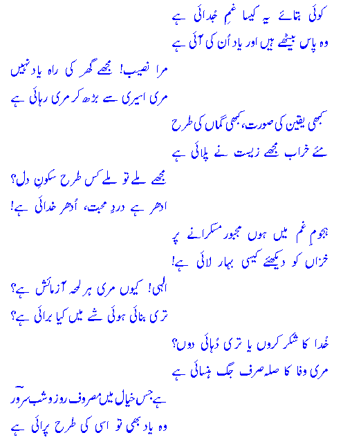 koyee bataaYe yeh kaisaa Gham-e-judaayee haivoh paas baiTh`e haiN or yaad un kee aayee hai!