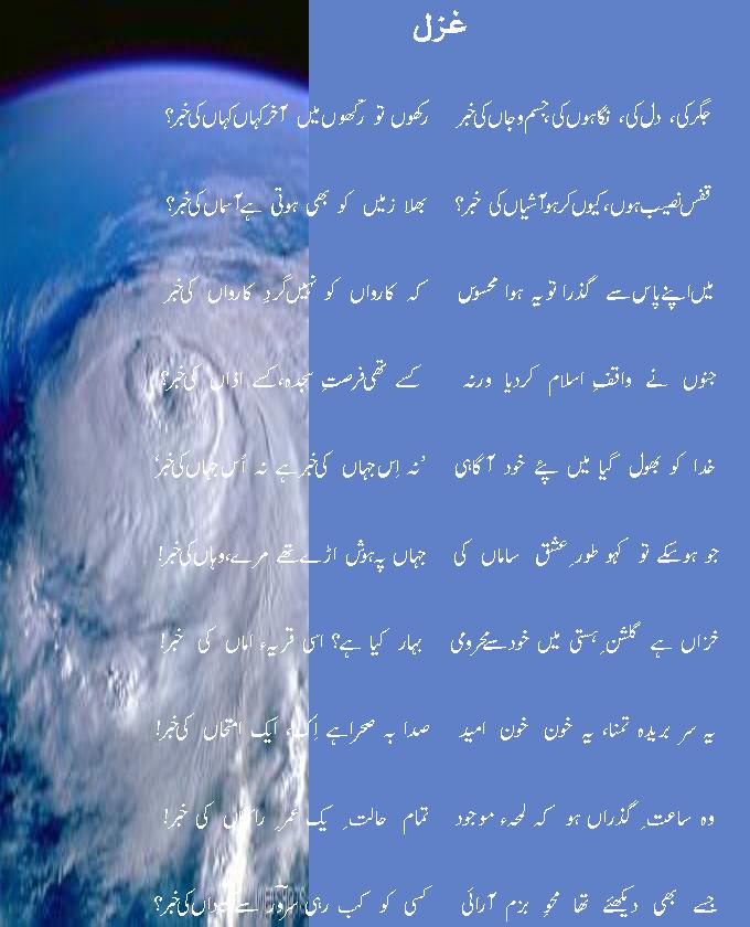 jigar kee, dil kee, nigaahoN kee, jism-o-jaaN kee Khabar
