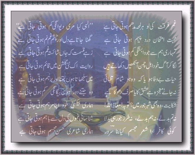 Gham-e-furqat kee lau har lamHeh maddh`am hotee jaatee hai:Ilaahee! kyaa miree deewaanagee kam hotee jaatee hai:?