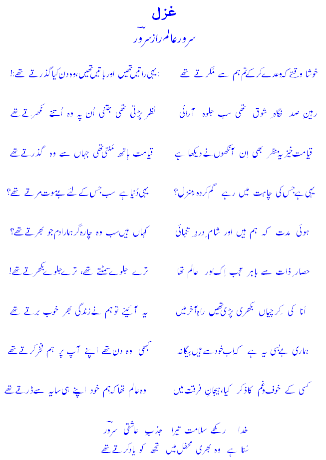 Khushaa-waqte keh wa'de kar ke tum ham se mukarte th`e"yehee raateN th`eeN aur baateN th`eeN, woh din kyaa guzarte th`e"!