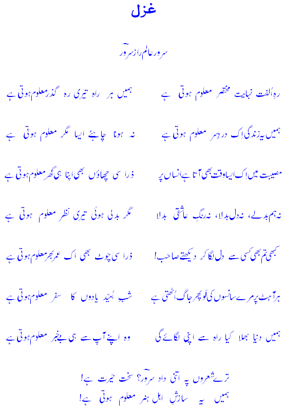 rah-e-ulfat nihaayat muKhtaSar ma'loom hotee haihameN har raah teree reh-guzar ma'loom hotee hai