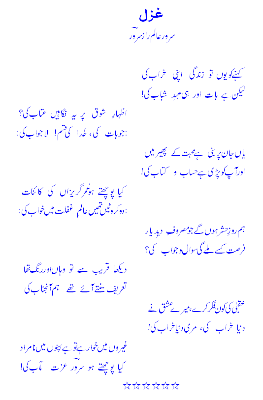 kehne ko yooN to zindagee apnee Kharaab keelekin hai baat aur hee eHd-e-shabaab kee!