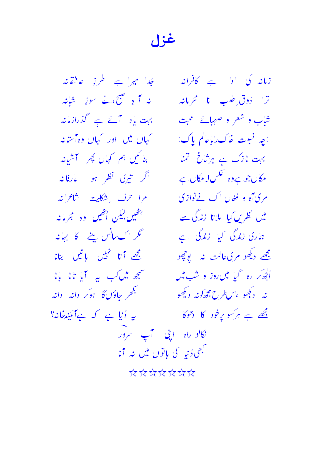 zamaane kee adaa hai kaafiraanahjudaa meraa hai t^arz^-e-a?shiqaanah