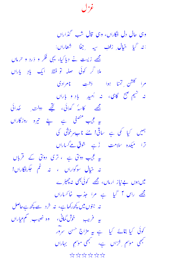 wohee haal dil-figaaraaN, wohee qaal-e-shab-guzaaraaN