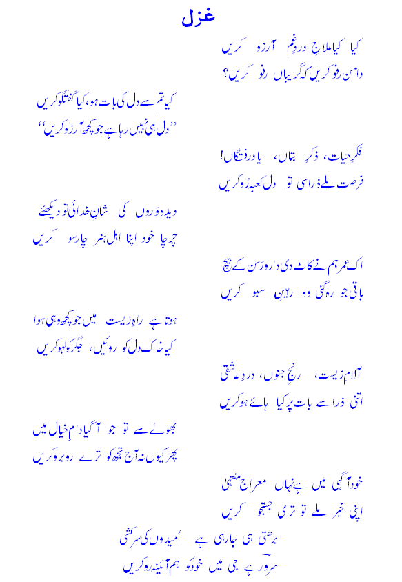 kyaa kyaa i'laaj-e-dard-e-Gham-e-aarzoo kareNdaaman rafoo kareN keh girebaaN rafoo kareN?