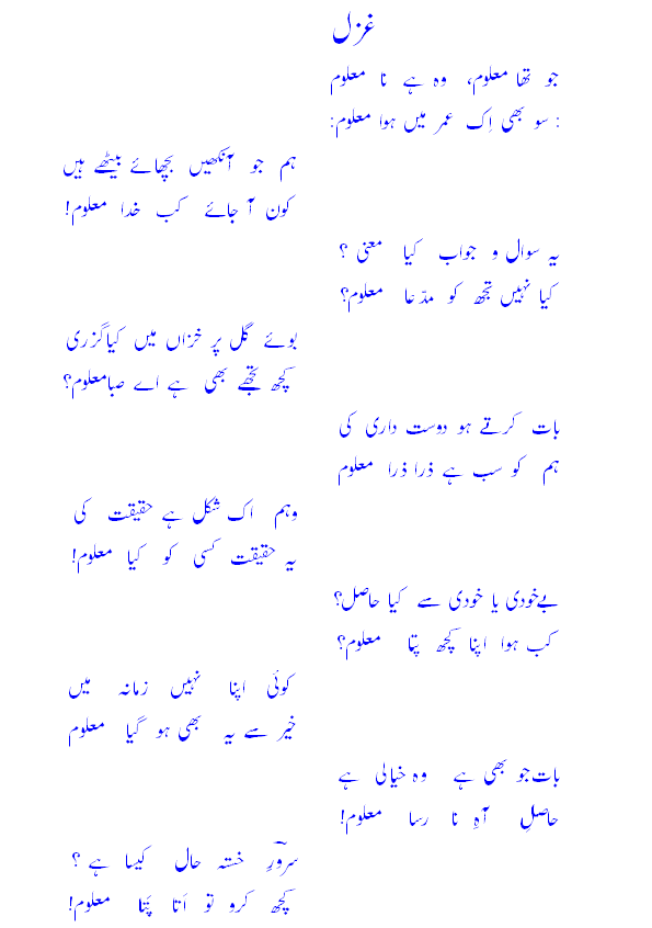 jo thaa ma'loom, woh hai naa-ma'loom"so bhee ik u'mr meN huwaa ma'loom!"