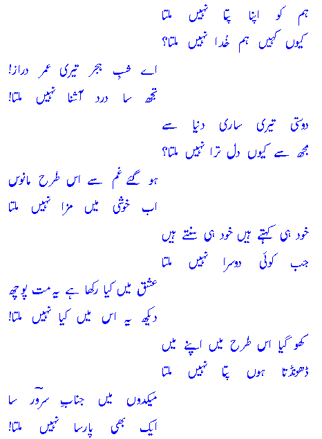 ham ko apnaa pataa naheeN miltaakyoN kaheN ham Khudaa naheeN miltaa?