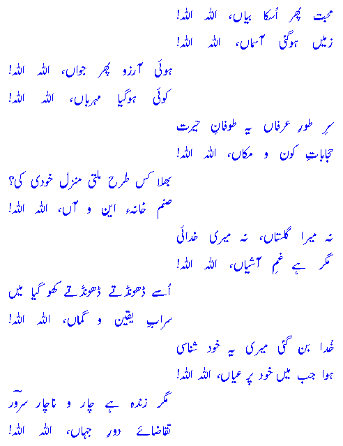 muHabbat! ph`ir us kaa bayaaN! Allah Allah!zameeN ho gayee aasmaaN, Allh Allah!