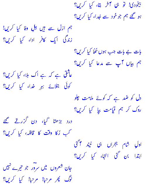 be-Khudee! too hee aaKhir bataa, kyaa kareN?ho gaye ham jo Khud se judaa, kyaa kareN?