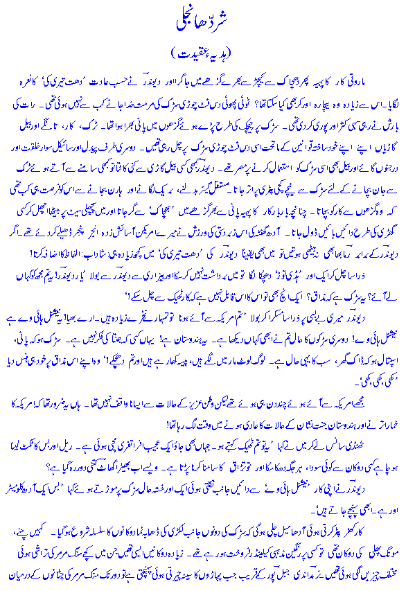 Shriddh`aanjalee (hadyah-e-a'qeedat)Maruti car kaa pahiyah ph`ir :dh`achaak: se keechaR se bh`are gaRh`e meN jaa giraa aur Dewendra ne ph`ir a'adata" kahaa "dh`at teree kee!". is se ziyaadah woh be-chaarah kar bh`ee kyaa saktaa th`aa? TooTee-ph`ooTee, Khastah-Haal das (10) foot chauRee saRak kee marammat jaane kab se naheeN huyee th`ee. raat kee baarish ne rahee sahee kacar aur pooree kar dee th`ee. saRak par chechak ke daaGhoN kee t^araH paRh huwe gaRh`oN meN paanee bh`ara huwaa th`aa. truck, car, taaNge aur bail-gaaRiyaaN isee saRak par apne apne Khud-saaKhatah qawaaneen ke teHt chal rahee th`eeN. doosree t^araf paidal aur cycle-sawaar Khalqat aur darjanoN gaaYe- bail bh`ee isee taNg saRak ko ista'maal karne par tule huYe th`e. Dewendra kabh`ee bail-gaaRee se kannnee kaaT,taa to kabh`ee saamne se aate truck se jaan bachaa kar apnee car saRak se neeche kachchee paTTee par utaar detaa. mustaqil gear badalne, brake lagaane aur horn bajaane se us ko furSat hee kab th`ee keh woh gaRh`oN se bach kar car chalaa saktaa? chunaan.ch Zaraa Zaraa see der ba'd car kaa pahiyah kisee gaRh`e meN :bhichaak: se jaa paRtaa aur maiN pich`kee seat par baiThaa uch`al kar gh`aRee ke pendulum kee t^araH daaYen-baaYen Dol jaataa. aadh` gh`anTeh kee is zabardastee kee warzish ne mere Amreekah ke aasaa,ish-zadah anjar-panjar Dh`eele kar diYe th`e. agar Dewendra ke baraabar Rama bh`aabh`ee nah baiTh`ee hoteeN to yaqeena" maiN bh`ee Dewendra kee "dh`at teree kee" meN kuch` ziyaadah hee :shaadaab: alfaaz^ kaa iZ^aafah kartaa!