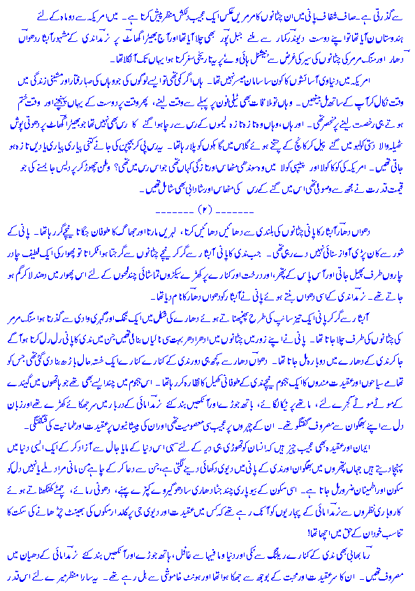 aabshaar se gir kar paanee ek tez saaNp kee t^araH ph`anph`anaate huwe dh`aare kee shakl meN ek taNg aur gehree waadee se guZartaa huwaa saNg-e- marmar kee chaTaanoN kee jaanib chalaa jaataa th`aa. paanee ne apne zor meN chaTaanoN meN bohat se ch`oTee ch`oTee naaliyaaN banaa lee th`eeN jin meN Narmada nadee kaa pavitra (=paak) paanee ril-ril kartaa aage jaa kar nadee ke dh`aare meN ph`ir se mil jaataa th`aa. DhuwaaNdh`aar se kuch` hee door nadee ke kinaar ek Khastah-Haal baaRh banaa dee gayee th`ee jis ko th`aame sayyaahoN aur a'qeedat-mandoN kaa ek hujoom jh`uk jh`uk kar paanee kaa t^oofaanee kh`el dekh` rahaa th`aa. is hujoom meN chand aise bh`ee th`e jo haath`oN meN geNde ke moTe moTe gajre liYe, maath`e par tilak kaa Teekah lagaaYe, haath` joRe aur aaNkh`eN band kiYe Narmada maayee ke darbaar meN kh`aRe th`e aur zabaan-o-dil se apne Bhagwaan se maSroof-e-guftgoo th`e. un ke chehroN par a'jeeb see ma'Soomiyat th`ee aur un kee peshaaniyoN par a'qeedat aur t^amaaniyat kee shiguftagee. eemaan aur a'qeedah bh`ee a'jeeb cheez haiN keh insaan ko, chand lamHoN ke liYe hee sahee, is dunyaa ke maayaa-jaal se aazaad kar ke ek aisee dunyaa meN poNhchaa dete haiN jahaaN patth`aroN meN bhagwaan aur nadee ke paanee meN deviyaaN dikh`aayee dene lagte haiN, jin se praarth`anaa kar ke chaahe man-maanee muraad mile yaa nah mile, dil ko sukoon aur it^meenaan Z^aroor mil jaate haiN. isee sukoon ke byopaaree chand jaTaa-dh`aaree saadh`oo geruve kapRe pehne, dh`oonee ramaaYe, chimTe kh`aT-kh`aTaa-te huwe kaarobaaree andaaz se Narmada maayee ke pujaariyoN ko aaNk rahe th`e keh kis meN a'qeedat kaa nashaa aur Narmada devee jee par kaldaar sikkoN kee bheNT chaRh`aanee kee sakat kaa tanaasub Khud un ke Haq meN achh`aa th`aa!