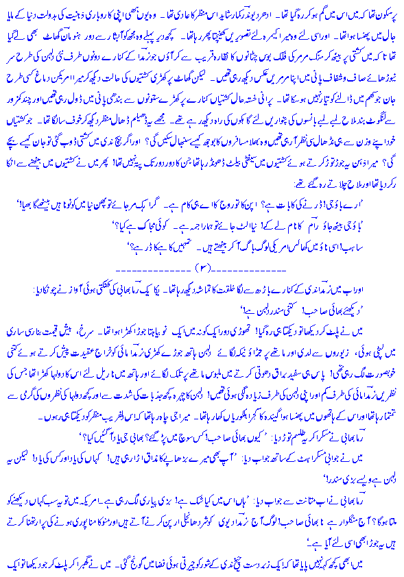 mujh`e Amreekah se aaYe huwe chand din hee huYe th`e magar apne wat^an ke Haalaat se aisaa naa-waaqif bh`ee naheeN th`aa. haaN yeh Z^aroor th`aa keh Amreekah kaa Khumaar utarne meN aur Hindustan-jannat-nishaan ke Haalaat kaa a'adee hone meN waqt lag rahaa th`aa. Th`anDee saaNs le kar maiN ne kahaa: "yeh to tum Th`eek kehte ho. jidh`ar jaa,o a'jeeb afraa-tafree machee huyee hai. rail aur bas kaa ticket lo yaa kisee dookaan se koyee saudaa, har jagah dh`akkam-dh`akkaa aur too-taRaaq kaa saamnaa karnaa paRtaa hai. waise ab Bheraghat kitnee door reh gayaa hai?"