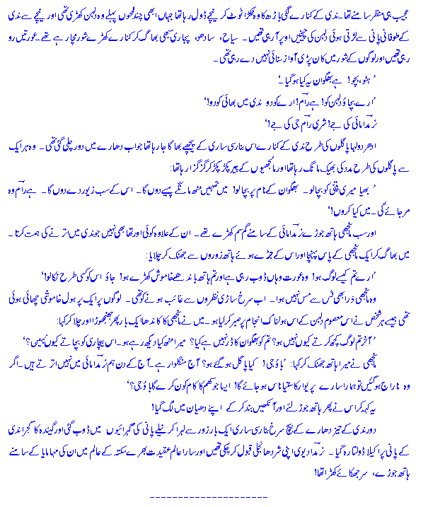 maiN abh`ee kuch` keh bh`ee naheeN paayaa th`aa keh ek zabardeest cheeKh nadee ke shor kaa seenah cheerte huYe fiZ^aa meN gooNj gayee! gh`abraa kar maiN ne palaT kar dekh`aa to a'jeeb manz^ar th`aa! baaRh kaa woh konaa TooT kar Dol rahaa th`aa jahaaN abh`ee woh dulhan kh`aRee th`ee aur neeche nadee kee t^oofaanee lehroN meN haath` pair maartee dulhan kee cheeKheN oopar tak aa rahee th`eeN. sayyaaH, pujaaree, saadh`oo, mallaaH sab bh`aag kar kinaare kh`aRe shor machaa rahe th`e. a'urateN ro rahee th`eeN aur logoN kee cheeKh-pukaar meN kaan paRee aawaaz sunaayee naheeN de rahee th`ee.
